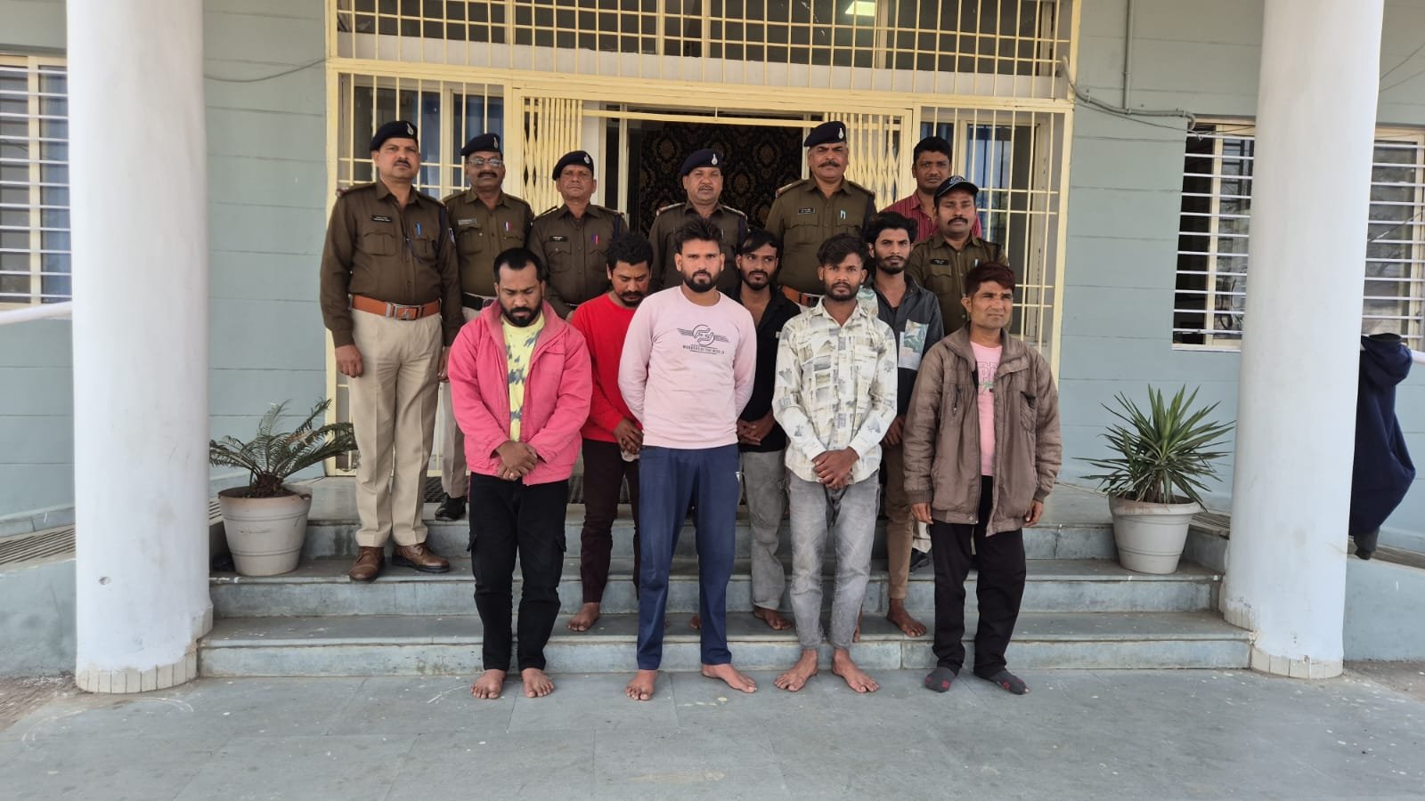 जिस तारतम्य में अतिरिक्त पुलिस अधीक्षक धार पारूल बेलापुरकर, अतिरिक्त पुलिस अधीक्षक विजय डावर एंव एस.डी.ओ.पी.महोदय विश्वदीप सिंह परिहार के निर्देशन में थाना अमझेरा क्षेत्र में अवैध जुआ खेलने की सूचना मिलने पर अमझेरा पुलिस द्वारा तास -पत्तो व नगदी रूपयों से जुआ खेलते मिलने पर हमराह फोर्स के द्वारा घेराबंदी कर आरोपीगण विशाल पिता रूगनाथ केवट उम्र 22 वर्षीय, सोनू उर्फ जयंत पिता कमल तम्बोली उम्र 28 साल वर्षीय, पंकज पिता मांगीलाल कुशवाह उम्र 40 वर्षीय, सुरज पिता तोलाराम केवट उम्र 24 वर्षीय, मोहसिन पिता मुन्ना मंसुरी जाति मुसलमान 30 वर्षीय, सुनिल पिता शोकल सिंह सोलंकी 27 वर्षीय,राज पिता जगदीश भामी जाति मारू उम्र 23 वर्षीय सभी आरोपी को अमझेरा निवासी को पकडा जिनके कब्जे से कुल 52 तास के पत्ते व 18,600 रूपये नगदी जप्त किये गये ।उक्त आरोपीयों की कार्यवाही में थाना प्रभारी अमझेरा निरीक्षक राजू मकवाना के नेतृत्व में उनकी टीम जिसमें उनि.नरबदसिहं ठाकुर, उनि.दिलीप खाण्डे, आर.926 लालसिंह भाबर, आर.487 करण कौशल का सराहनीय भूमिका रही है ।