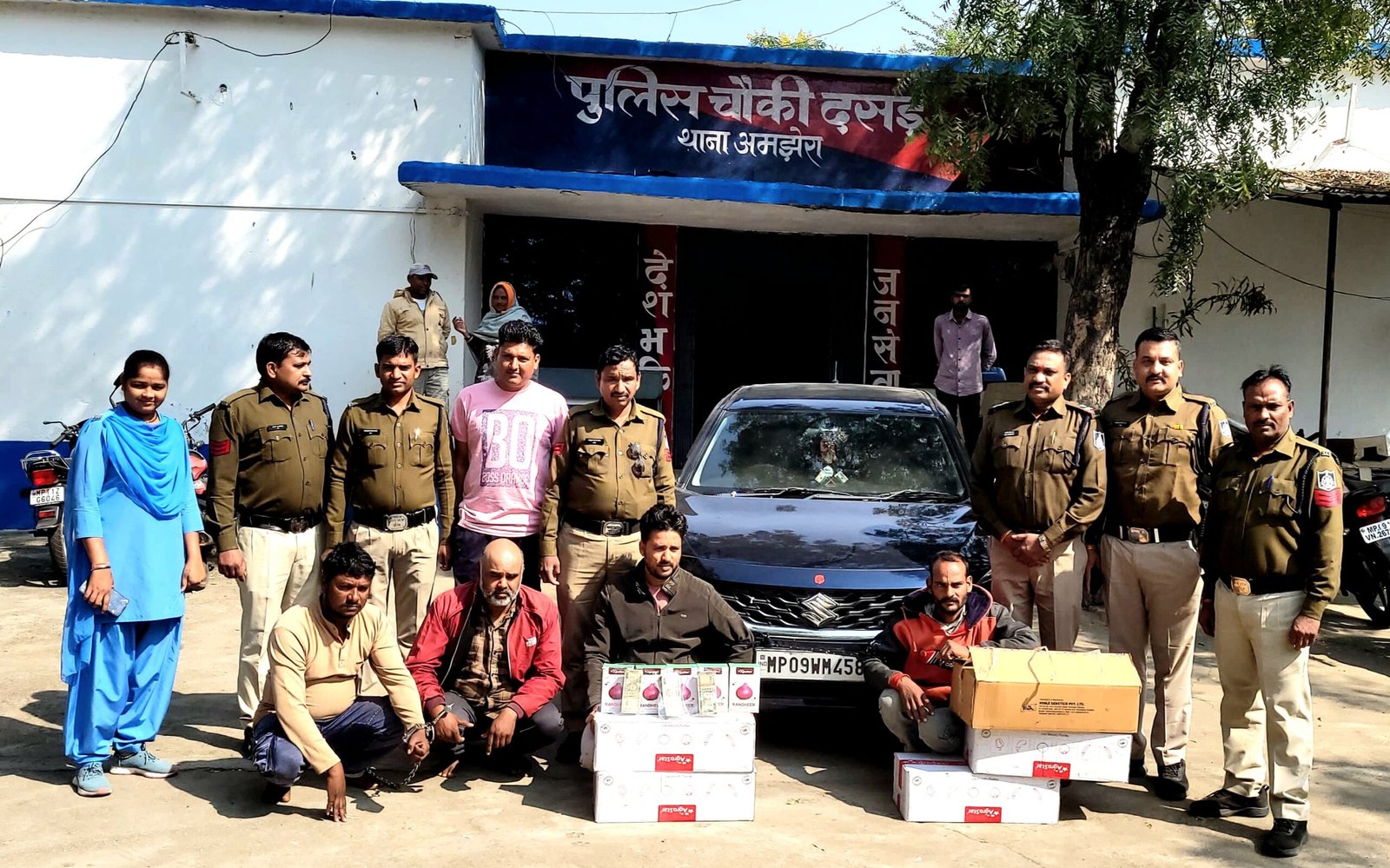 मध्यप्रदेश के धार जिले के सरदारपुर तहसील दसई 9 अक्टूबर को अज्ञात चोरो के द्वारा रात्रि को मे न्यू आदीनाथ ट्रेडर्स के गोडाउन से 11 प्याज के बक्सो मे जिनमे 110 किलो प्याज का बीज को चोरो के द्वारा चोरी की शिकायत न्यु आदिनाथ ट्रेडर्स के मालिक राजेश मंडलेचा (गप्पु सेठ) ने आवेदन देकर शिकायत की थी ।मौक पर दसाई पुलिस चौकी प्रभारी जगदीश चंद्र निनामा द्वारा अपनी टीम सहित पहुचे, चोर घटना स्थल से एक लोहे की टामी और तीन साड़ीयों के टुकडे कुछ बाक्स घटना स्थल से जप्त कर जांच प्रारंभ की । उपरोक्त शिकायत पर धार पुलिस अधीक्षक धार मयंक अवस्थी,अतिरिक्त पुलिस अधीक्षक धार पारुल बेलापुरकर के निर्देशन में सरदारपुर एसडीओपी विश्वदीप सिंह परिहार व् अमझेरा थाना प्रभारी राजू मकवाना व् दसाई पुलिस चौकी प्रभारी जगदीश चंद्र निनामा द्वारा अपनी टीम घटित कर चोरो को पकड़ा गया टीम द्वारा घटना स्थल से एक लोहे की टामी और तीन साड़ीयों के टुकडे जप्त कर घटना स्थल से सायबर टीम द्वारा टेक्नीकल साक्ष्य एकत्र कर पीएसटीएन डाटा उठाया गया । टेक्नीकल साक्ष्यों के आधार पर संदेही जो गरडावद मे कीटनाशक की दुकान संचालित करने वाला अनिल पिता कैलाश चौहान जाति बलाई उम्र 30 साल निवासी ग्राम खिलेडी व यादव कुमार पिता आशाराम प्रजापत निवासी खिलेडी के द्वारा घटना स्थल को पूर्व से रैकी करना व घटना दिनांक के समय आरोपी यादव कुमार प्रजापत चोरी से बचने के लिये घटना से पूर्व भोपाल चले जाना व चोरी होने के बाद वापस अपने घर ग्राम खिलेडी आना तथा अपने साथियों से चोरी गये माल में से अपने हिस्से में आये माल को अनिल से प्राप्त करना पाया गया। आरोपी अनिल पिता कैलाश चौहान जाति भील, यादव कुमार पिता आशाराम प्रजापत जाति , जितेन्द्र पिता वरदीचन्द मालवीय निवासीगण ग्राम खिलेडी व भेरूलाल पिता रामलाल गामड निवासी ग्राम बामन्दा खुर्द को गिरफ्तार कर आरोपीगण से प्रथक-प्रथक पूछताछ कर मेमोरेण्डम लेख कर घटना में प्रयुक्त बलेनो कार क्र. MP09WM4588 व चोरी गया मश्रुका 55 किलो एग्रोस्टार कम्पनी का प्याज का कण व बैचे गये कण के नगदी 1,10,000/- रूपये बरामद किया गया। जबकि आरोपी करण गौसर निवासी टीमरीपाडा दत्तीगाँव का फरार चल रहा है। गिरफ्तारशुदा आरोपीगण से थाने के अन्य अपराधो में पूछताछ की जा रही है।