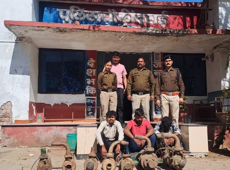 दसई चौकी क्षेत्र में लगातार हो रही चोरी को लेकर मीडिया के द्वारा प्रमुखता से खबर दिखाए जाने के बाद पुलिस विभाग आया हरकत में और किसानों के खेत से पानी की मोटर चोरी करने वाले आरोपियो को किया गिरफ्तार, डेढ़ लाख रुपये की पानी की मोटरे की गई जप्त. पुलिस ने किसानों के खेत से पानी की मोटर चोरी करने वाले 4 आरोपियो को गिरफ्तार किया है। तथा1 लाख 50 हजार रूपये कीमत की 7 पानी की मोटरें की बरामद की गई है। धार एसपी मनोज कुमार सिंह, एएसपी डॉ. इंद्रजीत बाकलवार के निर्देश पर तथा सरदारपुर एसडीओपी विश्वदीपसिंह परिहार व अमझेरा थाना प्रभारी डॉ. आयुष जाखड़ (आईपीएस) के मार्गदर्शन में चौकी प्रभारी ओमप्रकाश बड़ोनिया की टीम ने सफलता हासिल की है।चौकी प्रभारी ओमप्रकाश बड़ोनिया ने बताया कि दिनांक 17 फरवरी की रात्रि में ग्राम दौलतपुरा में पानी की मोटर चोरी कर बाइक पर जा रहा एक चोर गिर गया था व उसके पैर पर पानी की मोटर गिरने से उसका पैर टूट गया। उक्त चोर को ग्रामीणों ने पकड़कर पुलिस के सुपुर्द किया था। पकडे गये चोर रंजीत पिता सुखराम उम्र 26 साल निवासी ग्राम चिचोड़िया थाना सरदारपुर के विरूद्ध प्रकरण दर्ज कर उसके कब्जे से एक पानी की मोटर व उसकी बाइक को मौके से जप्त कर आरोपी को अस्पताल में भर्ती करवाया गया था व अन्य आरोपियों के बारे में रंजीत से पूछताछ कर तीन आरोपी रंजीत पिता दौला, उम्र 28 साल निवासी ग्राम दौलतपुरा थाना अमझेरा, रीतेश पिता संतोष उम्र 19 साल निवासी ग्राम चिचोड़िया थाना सरदारपुर जिला धार व कमलेश पिता नंदराम उम्र 25 साल निवासी ग्राम दौलतपुरा गिरफ्तार किया है। आरोपियों से अभी तक पुलिस द्वारा पानी की मोटर सहित व एक बाइक बरामद की गई। आरोपियो की गिरफ्तारी में प्रधान आरक्षक ईश्वर भूरिया, अब्दुल रऊफ व महिला आरक्षक विजया, सैनिक बाबूलाल मकवाना व रितुराज चौहान की भूमिका रही।